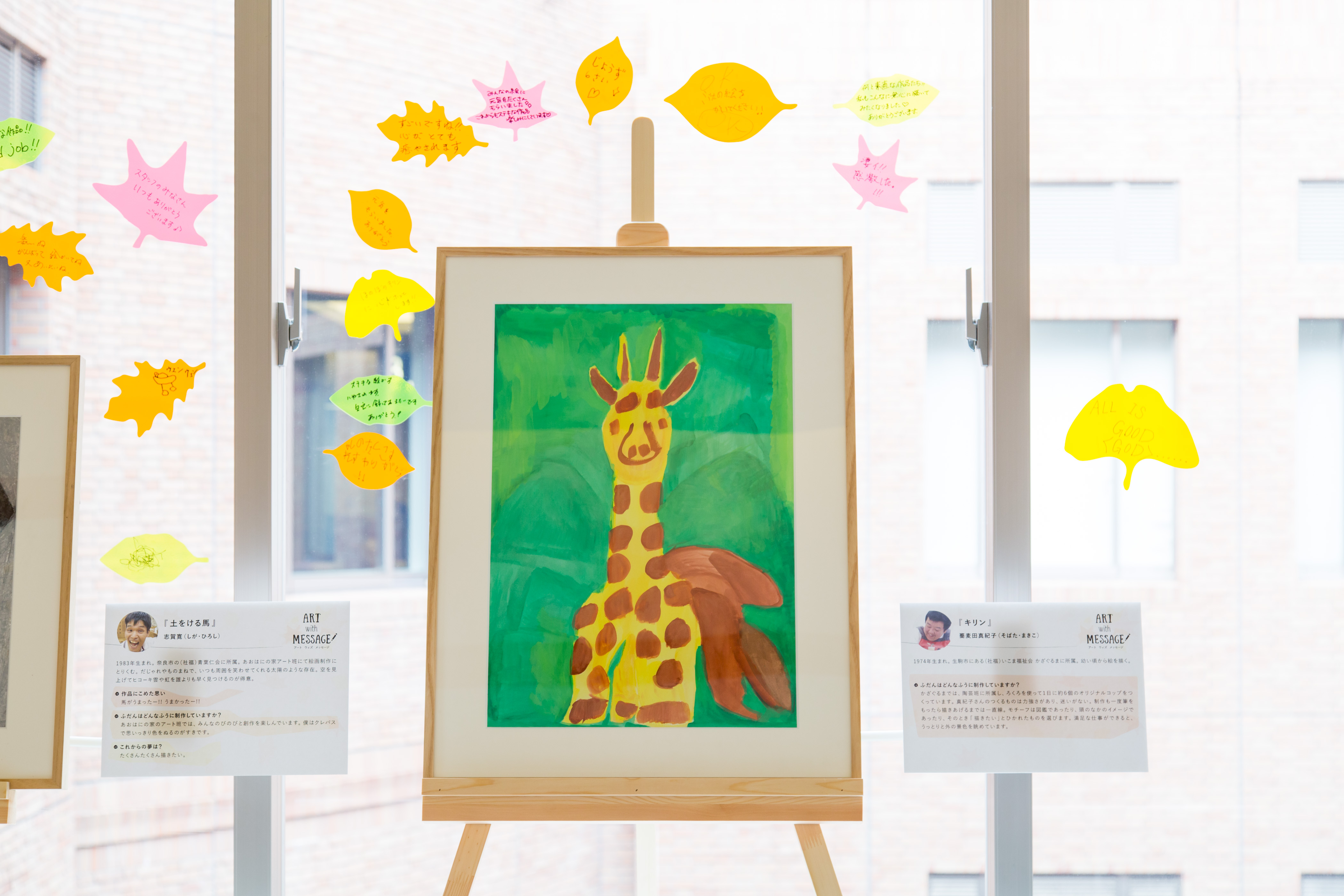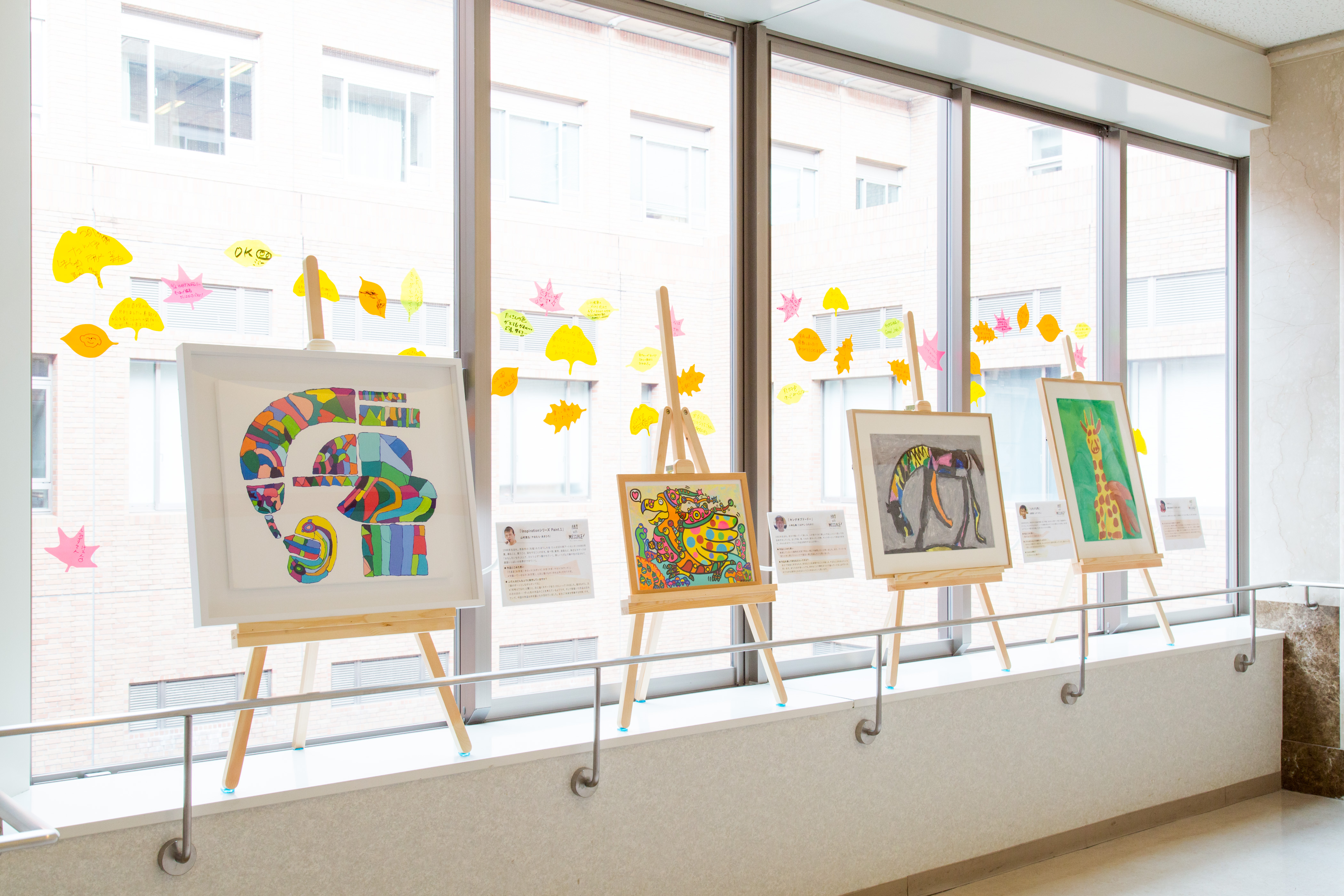シンプルな展示は、作品や窓面に貼られたメッセージカードを活かしながら空間に溶け込み、また万一の緊急撤去にも直ちに対応できるものとなっています。