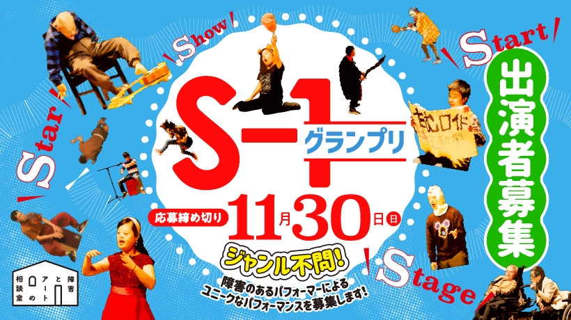 「S-1グランプリ」はそんなユニークなパフォーマーを発掘すべく、昨年から始まった公募によるパフォーマンス・グランプリです。S=障害、ショー、スタート、スターなどなど、色々な思いを込めて。枠にとらわれない、既存の価値観をひっくりかえすようなパフォーマンスをお待ちしております!!
