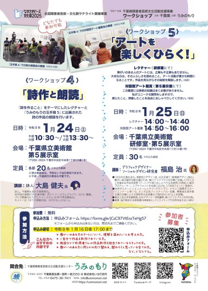 また、表現の手法や作家と支援者の関わり方など文化芸術活動を通した支援の実践について学び合います。