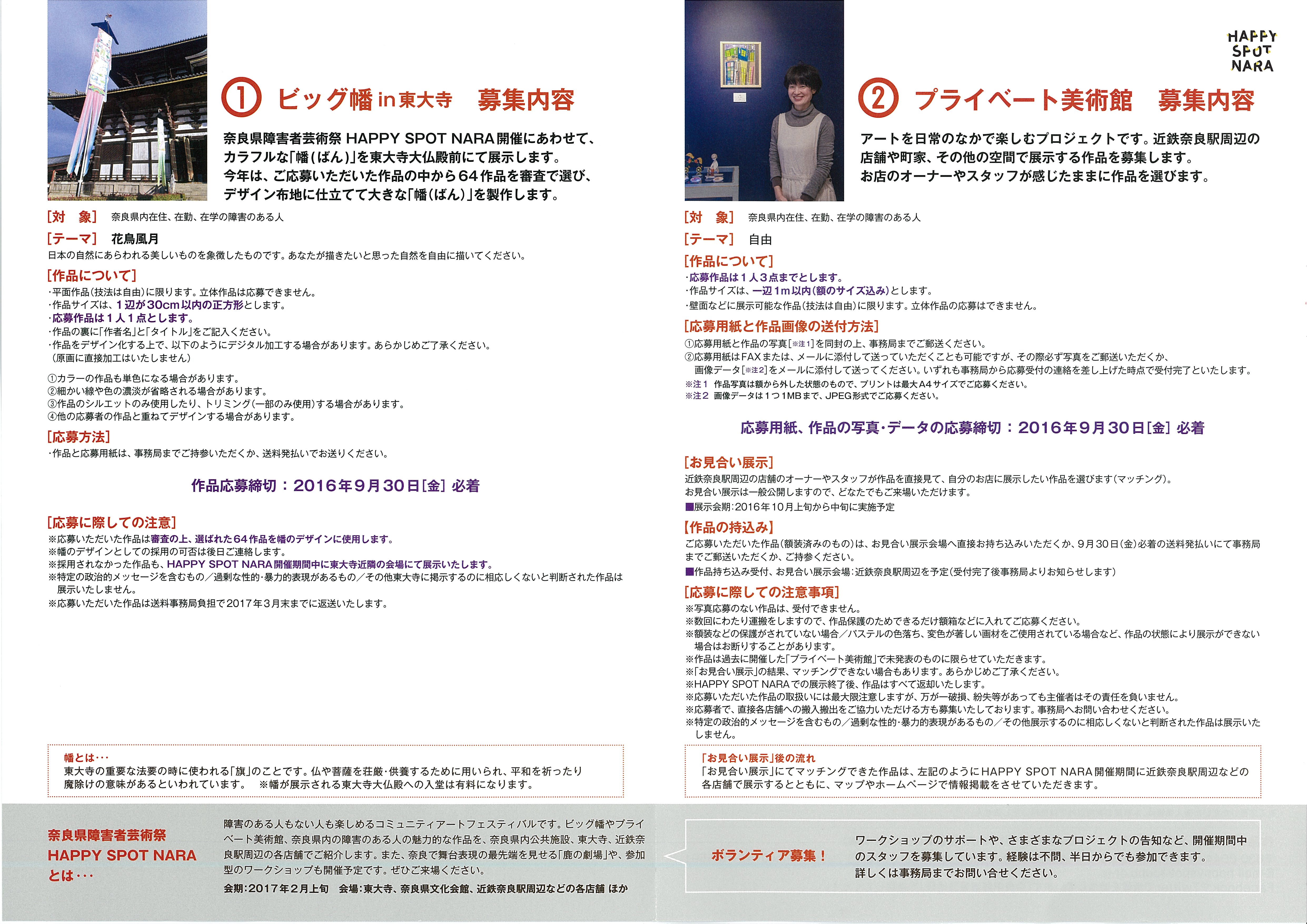 本年度、たんぽぽの家では「奈良県障害者芸術祭 HAPPY SPOT NARA 2016-2017」の一環として、2つの企画に関して作品募集を行っています。詳しくは画像およびたんぽぽの家ホームページをご参照下さい。